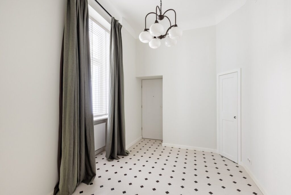 High ceilings, large windows, and the classic architecture of the tenement building give the interior a unique atmosphere and elegance characteristic of the historic buildings in this part of the city.