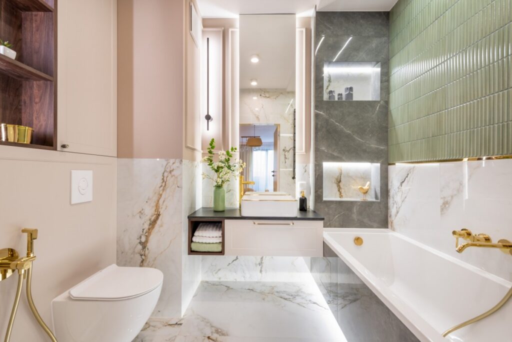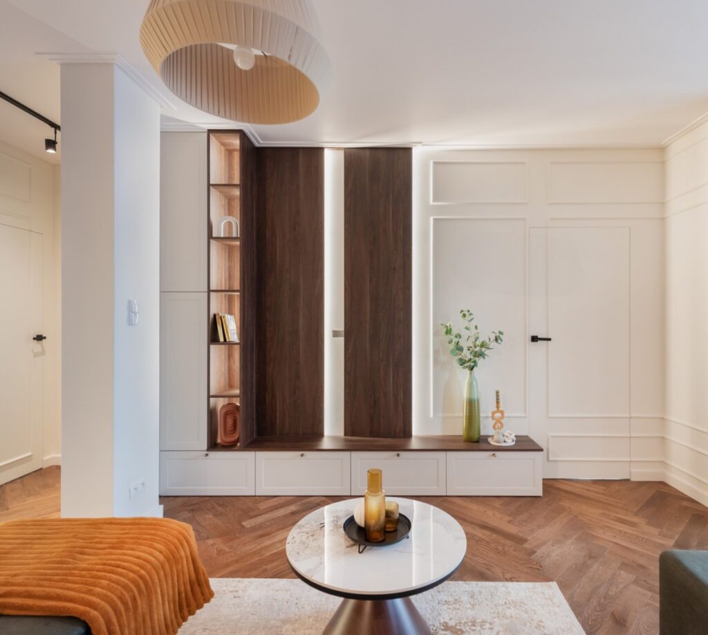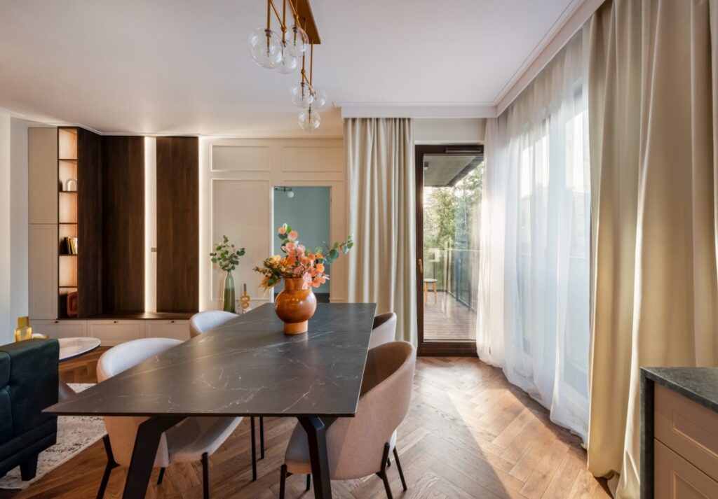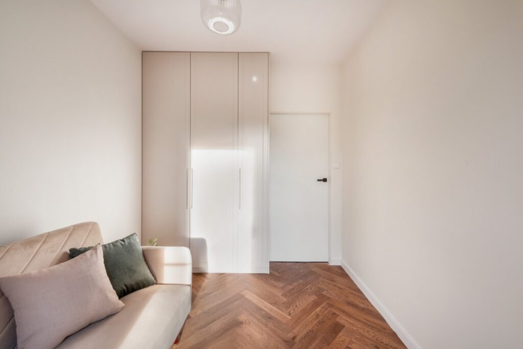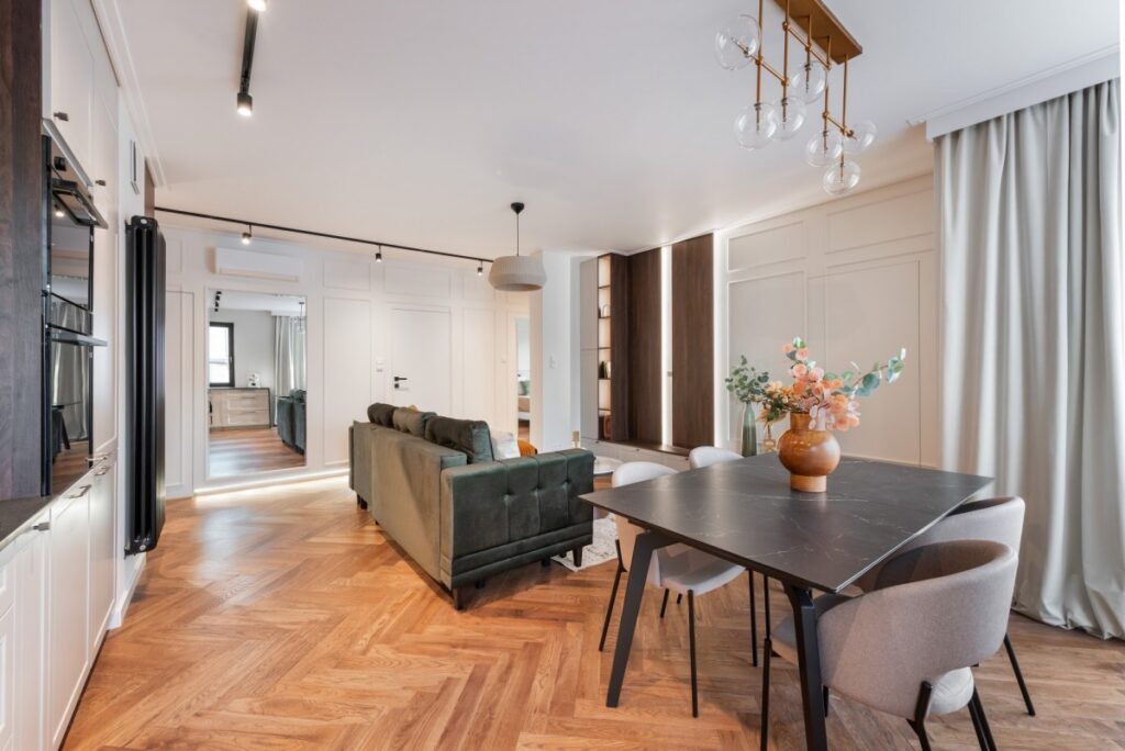 Wnętrze mieszkania wykończone zostało z wyjątkową starannością i dbałością o detale, przy użyciu materiałów najwyższej klasy. Na podłogach położono klejoną deskę dębową, która nadaje przestrzeni naturalnego ciepła i elegancji. Kuchnia oraz łazienki zostały wyposażone w blaty z litego granitu, a ściany w łazienkach wykończono sprowadzanymi z Hiszpanii płytkami, wyróżniającymi się unikalnym designem i wysoką jakością. Wszystkie meble zostały wykonane na zamówienie – w całości lakierowane, co podkreśla spójność i luksusowy charakter wnętrza. Całość uzupełniają drzwi wewnętrzne renomowanej firmy DRE, a także dwie jednostki klimatyzacji, zapewniające komfort niezależnie od pory roku.