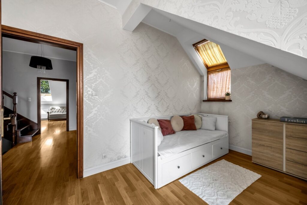 na górze – 3 sypialnie, druga łazienka i garderoba.
