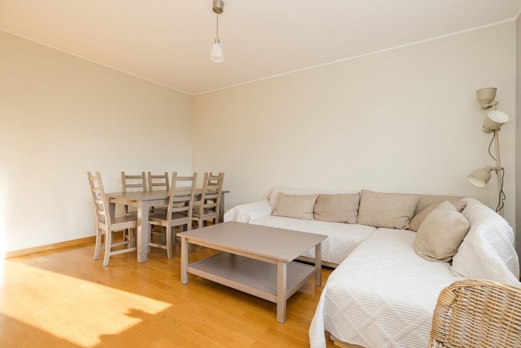 Przestronny salon z dużymi oknami wychodzącymi na południe, wyposażony w meblościankę, stół i kanapę, wygodna jadalnia (może pełnić funkcję pokoju dziennego), jasna, w pełni wyposażona kuchnia z oknem, niewielki hol, łazienka z kabiną prysznicową.