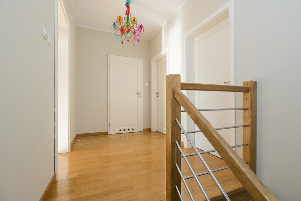 W jadalni eleganckie, drewniane schody prowadzące na drugi poziom.