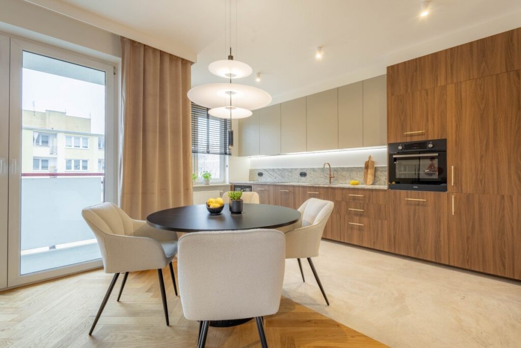 – przytulny klimatyzowany salon,z wydzieloną jadalnią, doświetlony dużymi oknami z wyjściem na kształtny balkon 6 m2