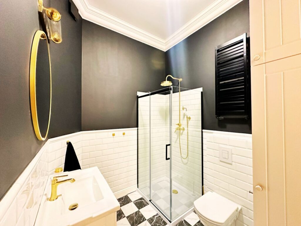 Mieszkanie zostało zaprojektowane w standardzie premium, z wykorzystaniem szlachetnych materiałów oraz precyzyjnie dobranego wyposażenia, które pozostaje w cenie. Wysokość pomieszczeń 3,5 m podkreśla charakter przedwojennej architektury i nadaje wnętrzu wyjątkowy, loftowy majestat.