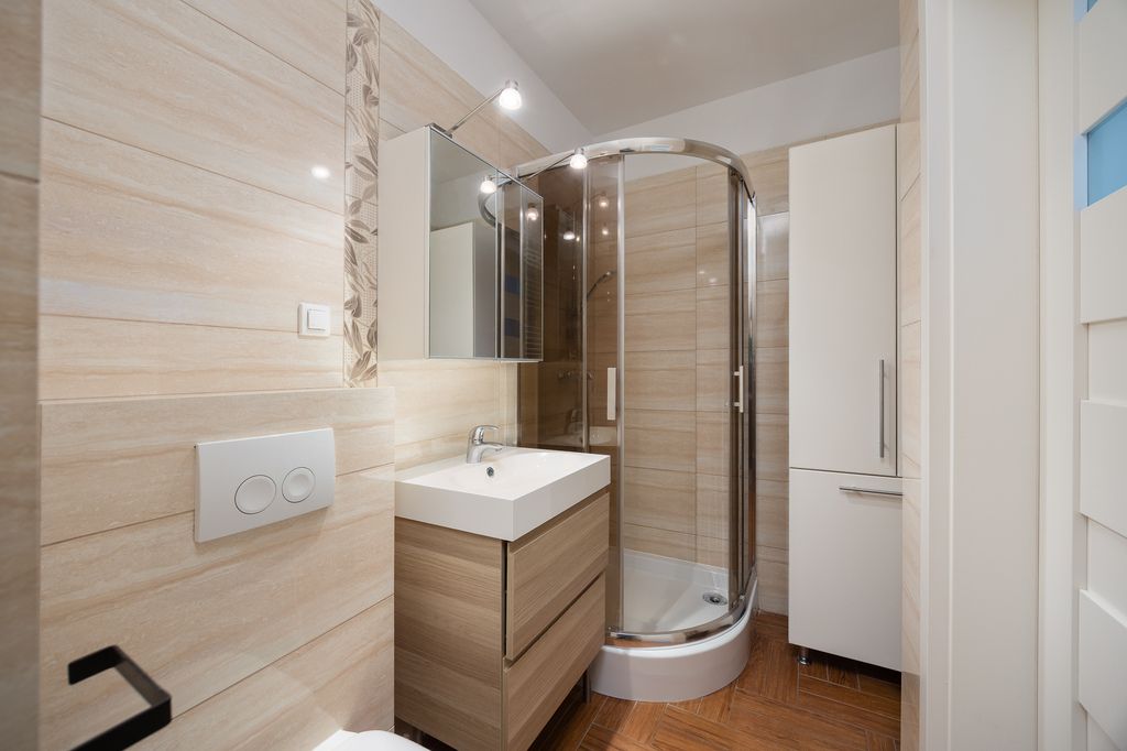 Mieszkanie jest w bardzo dobrym stanie technicznym, świeżo odświeżone i odmalowane. Wnętrze wykończone jest w ponadczasowym standardzie, z panelami oraz gresem na podłogach. W łazience znajduje się prysznic. Nowoczesne drewniane okna skierowane są na zachód, dzięki czemu mieszkanie jest dobrze doświetlone i pozostaje ciche, ponieważ wychodzi na wewnętrzne patio.