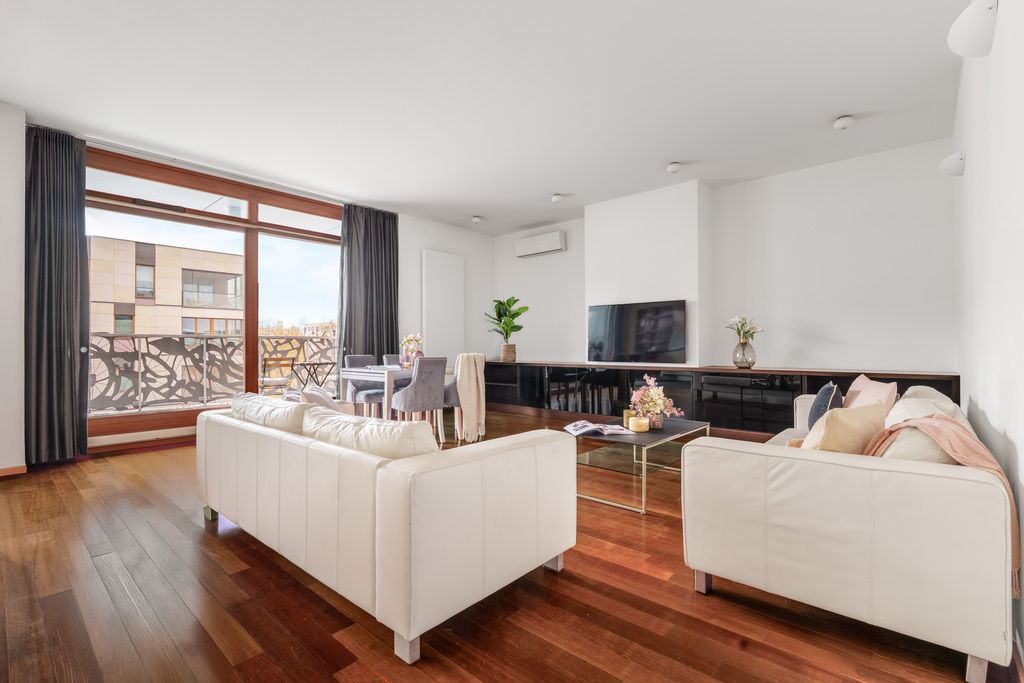 We invite you to a unique, modern apartment with an area of 107.2 m², situated in a prime location at 5 Franciszka Klimczaka Street, in the prestigious Fountain Wilanów development.