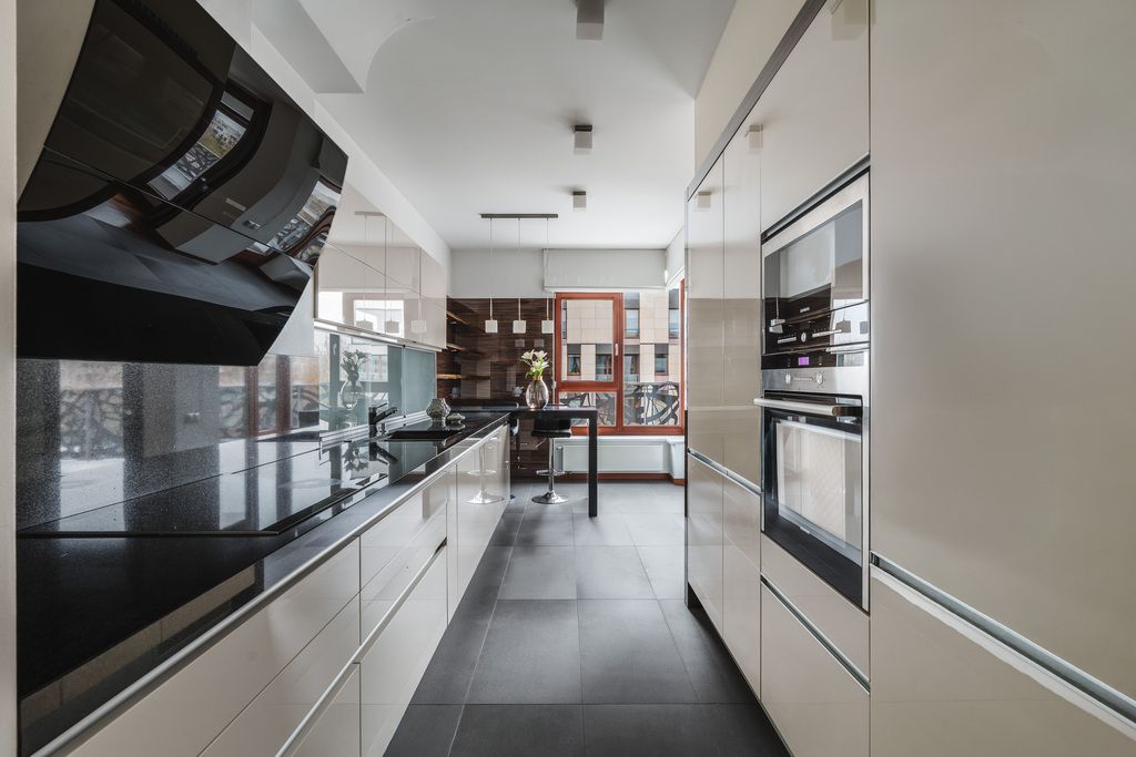 – kitchen with full furniture and an island,