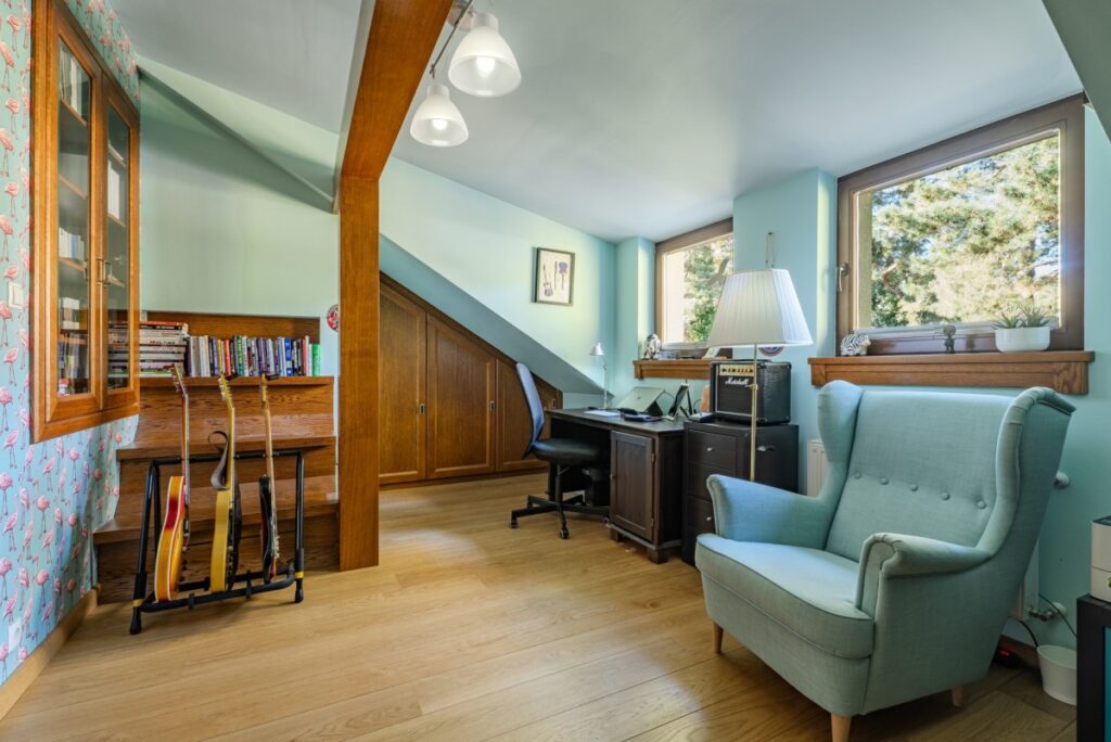 Poddasze domu jest w pełni wykończone i może służyć jako dodatkowy pokój zabaw dla dzieci lub przestrzeń do przechowywania.