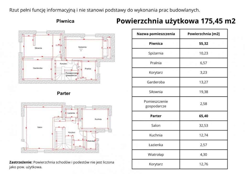 - Piwnica – 55,32 m2, parter – 65,40 m2, piętro – 46,58 m2, poddasze – 8,15 m2 pow. użytkowej